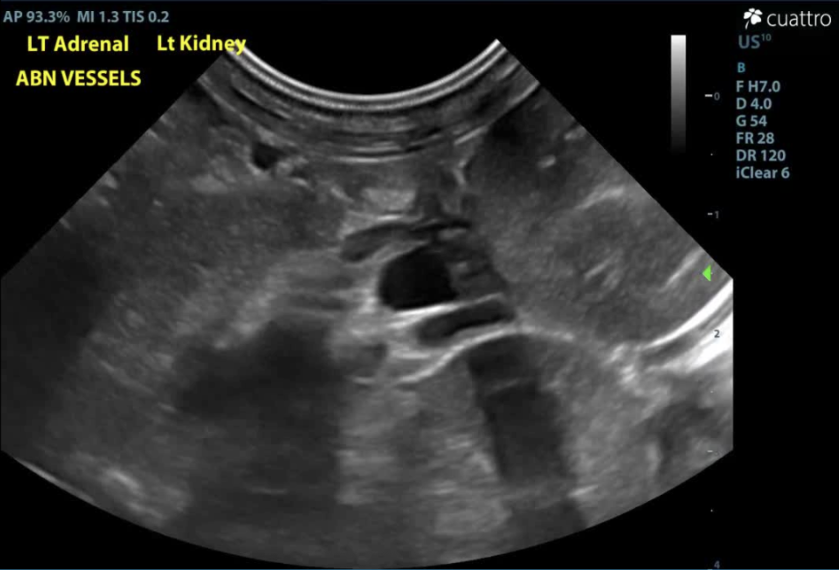 An abnormal vascular pattern is appreciated in the left cranial abdomen which obscures visibility of the left adrenal gland.