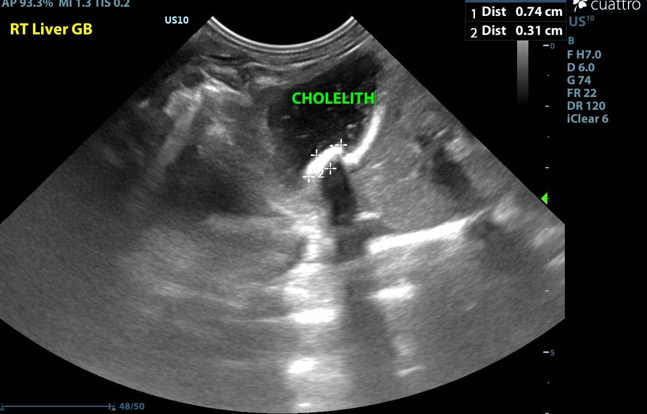 Cholelithiasis the finding is mild - DDx: Neoplasia (gall bladder, common bile duct), cholangiohepatitis, hepatitis, hypercholesterolemia, hyperbilirubinemia, hypertriglyceridemia, dietary, gallbladder dysmotility