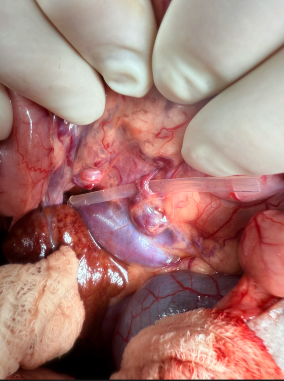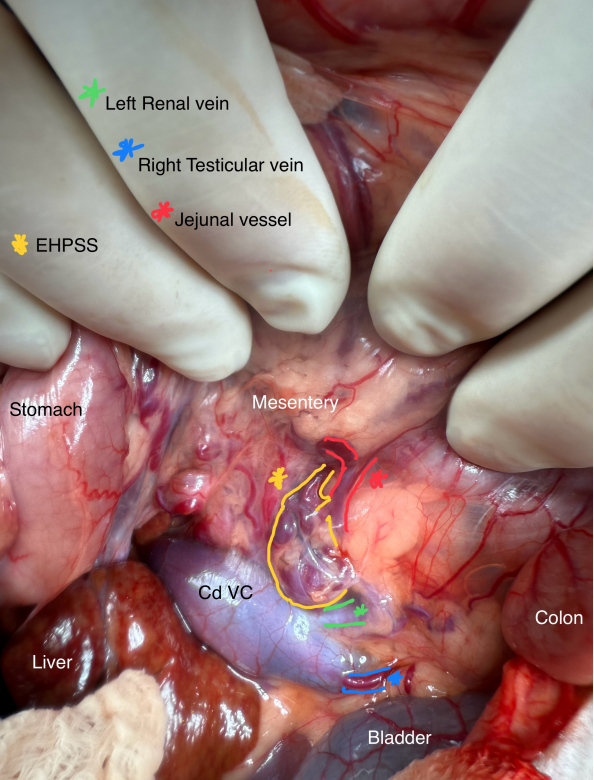 - The gallbladder was of normal color, soft, mildly to moderately dilated, but normally expressible. The cystic duct and common bile ducts were both moderately dilated without evidence of obstruction. Intrahepatic biliary ducts were not able to be visualized. - After continued exploratory, the anomalous shunting vessel was identified; it was extremely short and markedly tortuous, forming multiple acute angles on itself. The tortuous vessel was noted to originating from dorsal and deep to the stomach, coursing deep to the pancreatic and splenic vasculature, before entering the Caudal Vena Cava immediately cranial and adjacent to the left renal vein. A mild amount of turbulent flow was noted within the Caudal Vena Cava, near the point of entry of the anomalous vessel. No additional abnormalities noted during exploratory.
